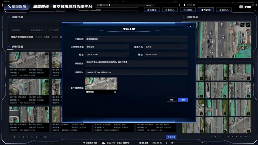 通过飞行器RTK定位与视觉SLAM技术,平台能为垃圾事件提供厘米级空间坐标。在凤城某老旧小区,无人机拍摄到墙角堆积的生活垃圾后,系统立即生成包含经纬度、周边环境的精准工单,直接推送至属地街道和环卫部门,解决了“说不清具体位置”导致的处置拖延问题。